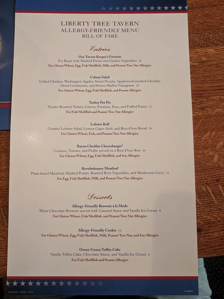 Liberty Tree Tavern Allergy Friendly Lunch Menu Gluten Free Dairy Free At Wdw